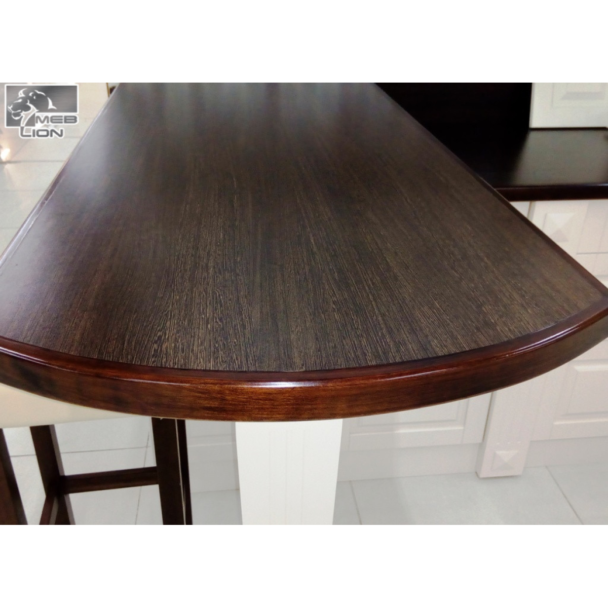 Матеріали: фасади — МДФ фарбування напівматова, корпус — ЛДСП, фурнітура — Блюм (Австрія), стільниця та барна стійка — пластик на вологостійкому основі, обкладка стільниці — дерево.