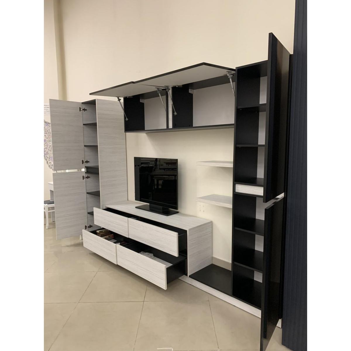 Поєднання світлої деревини та чорного глянсу у цьому виробі є родзинкою. Стиль мінімалізм підкреслюється відсутньостю ручок, але відкривання при цьому залишається дуже зручним.  4 глибокі шухляди на прихованих направяючих у центральній тумбі фактично виконують роль класичного комоду.