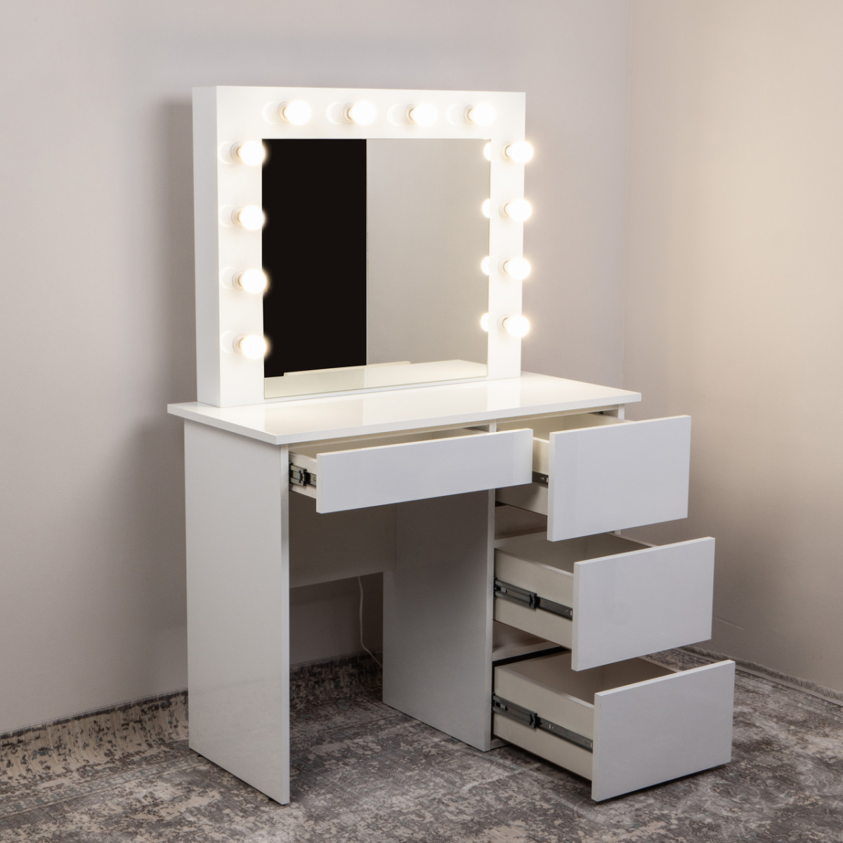 Стіл має 4 ящика на телескопічних напрямних повного висування, щоб усе було під рукою, і яскраву підсвітку дзеркала, що дасть Вам впоратися з максимально швидко та якісно.