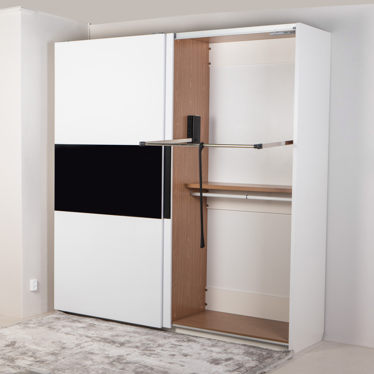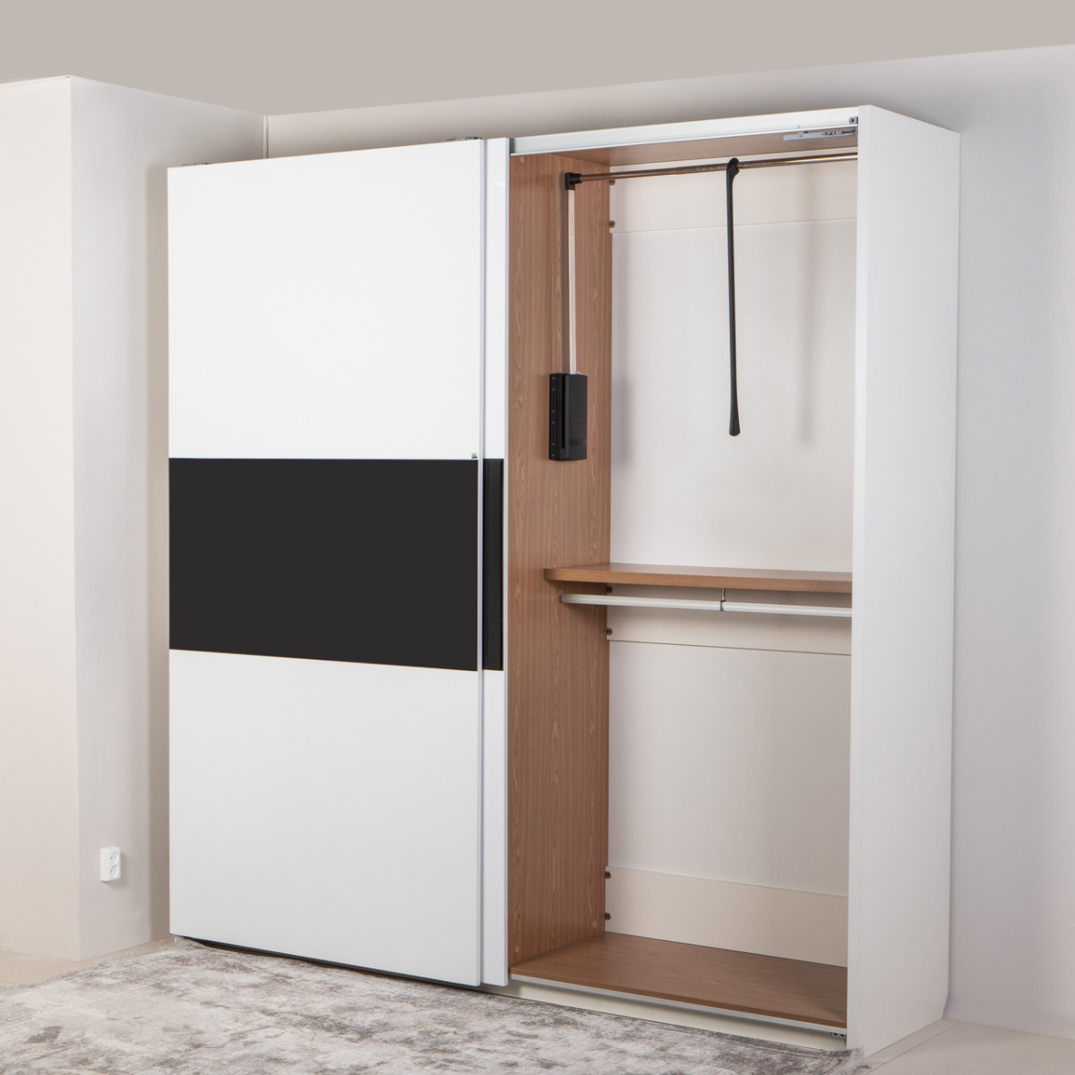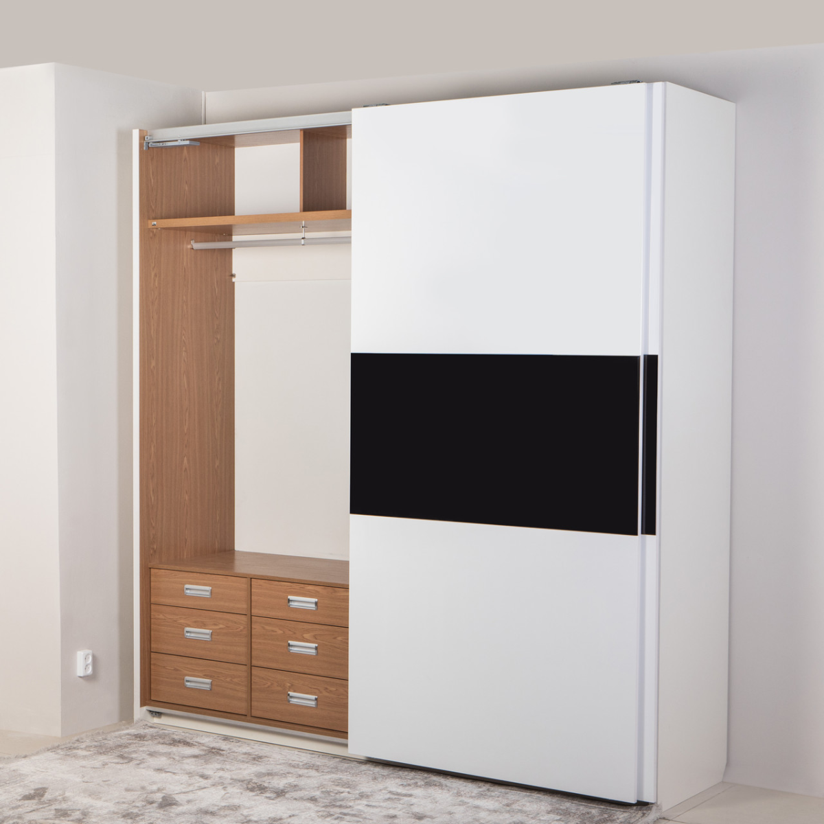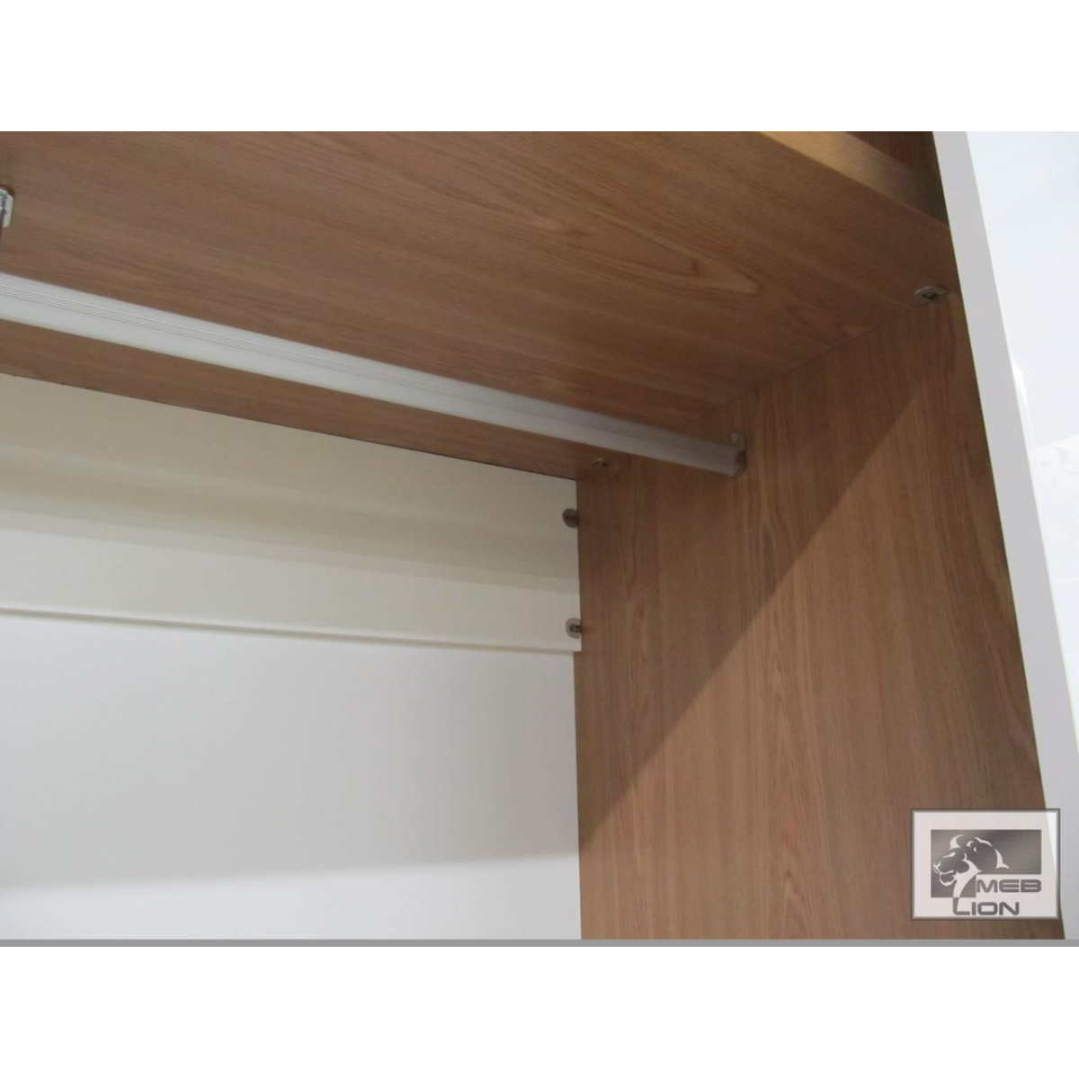 В одній частині шафи ліфт для одягу та штанга дають змогу вішати речі на плічках у 2 рівні за висотою. В іншій частині шафи штанга для більш довгого одягу, антресоль і 6 шухляд. Звертаємо увагу, що внутрішня частина шафи відрізняється від зовнішньої за кольором.